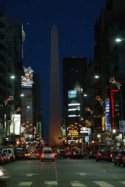Nochmals der Obelisk, diesmal bei Nacht aus der Avenida Corrientes fotografiert